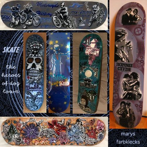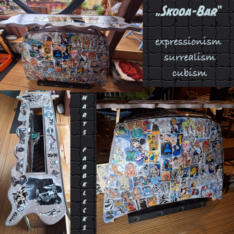 Zusätzlich hat Mary auch noch die Kraft aufgebracht, wie von Zauberhand, ihrer Airbrushpistole, noch einige neue Kunstwerke zu entlocken. Natürlich ist es keine Zauberei, sondern viel Arbeit. Ich möchte euch heute einige der Werke zeigen und ein bisschen darüber erzählen. Unsere Idee war es, kleinere Dekoartikel ins Farbklecks Sortiment aufzunehmen. Um in jeder Größe etwas anbieten zu können, haben wir verschiedenste Haushaltsgegenstände wie Spiegel, Schranktüren, Glasscheiben, Skateboards, Schallplatten und noch ein paar mehr Gegenstände künstlerisch gestaltet.
