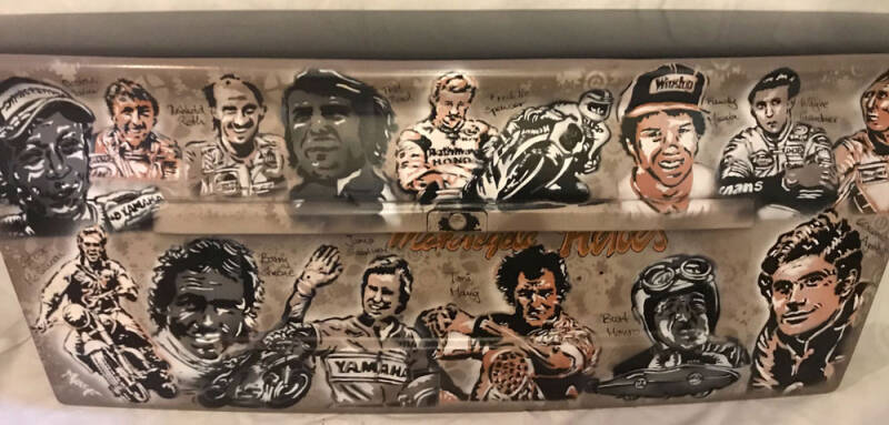 Barry Sheene, Carlo Ubbiali, David Jefferies, Robert & Joey Dunlop, Ernst Degner, Ernst Müller, Evel Knievel, Frank Burgess, Giacomo Agostini, Juan Pagamo, Jim Redman, Kork Ballington, Mick Doohan, Nicky Hayden, Phil Read, Rolf Biland, Steve Hislop, Steve McQueen, Toni Mang, Valentino Rossi, Angel Nieto, Jimmie Guthrie, Mike Hailwood, OmobonoTenn.