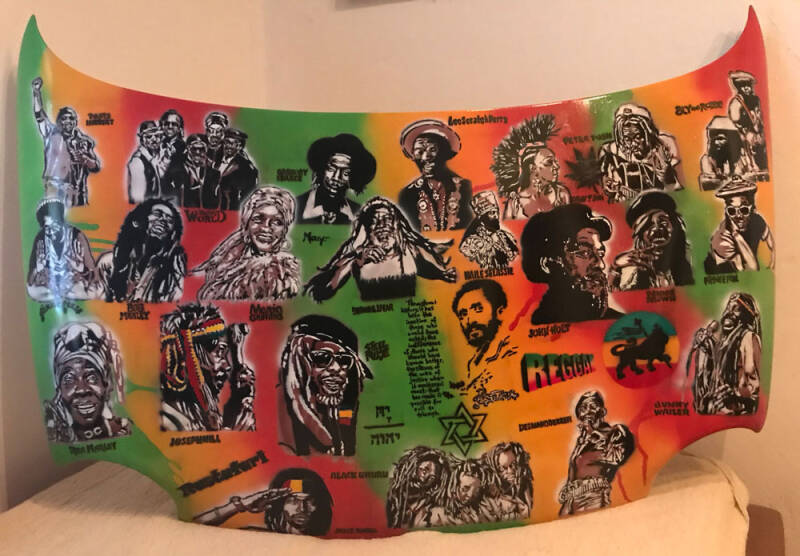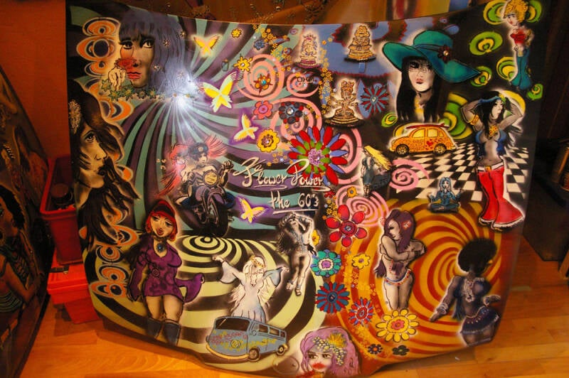 Da wir beide diese Art zu Leben lieben und die damaligen Pioniere dieser Lebensart bewundern, ist eine weitere Haube entstanden, die diese Lebensweise hervorhebt. Man darf nicht vergessen, dass das in den 60er und 70er Jahren alles andere als normal war. Wir beide ziehen unseren Hut und sagen Danke das Ihr uns den Weg geebnet habt und haben deswegen verschiedene Szenen auf einer weiteren Haube verewigt.